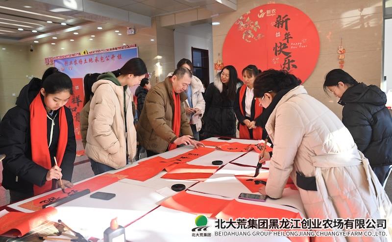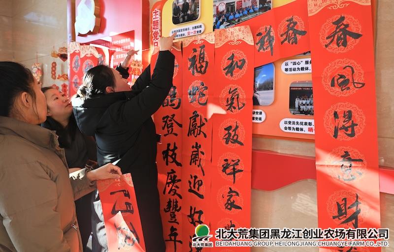 本网讯(潘爱龙 魏思雨)无联不成春,有联春更浓。为进一步弘扬中华传统文化,营造喜庆、文明祥和的节日氛围,春节期间,创业农场有限公司开展“笔墨迎新春、春联送福至”活动,为广大职工群众送上充满年味的文化盛宴,敲响春节的喜庆钟声。